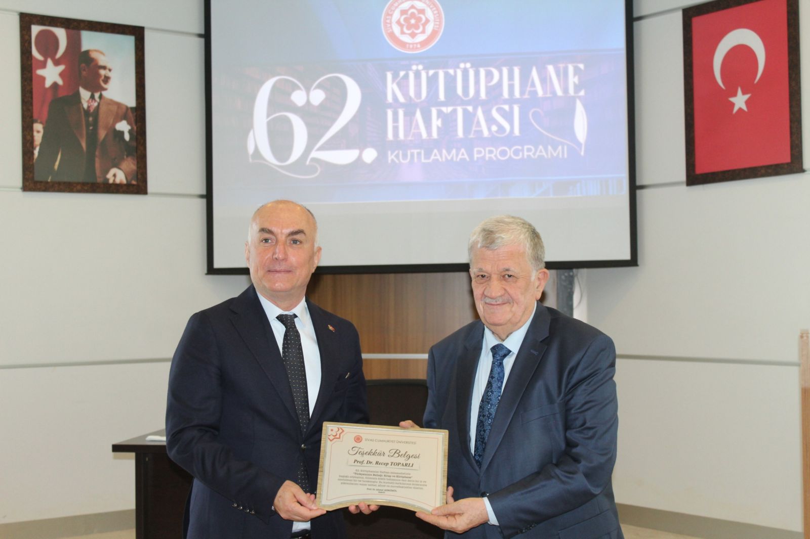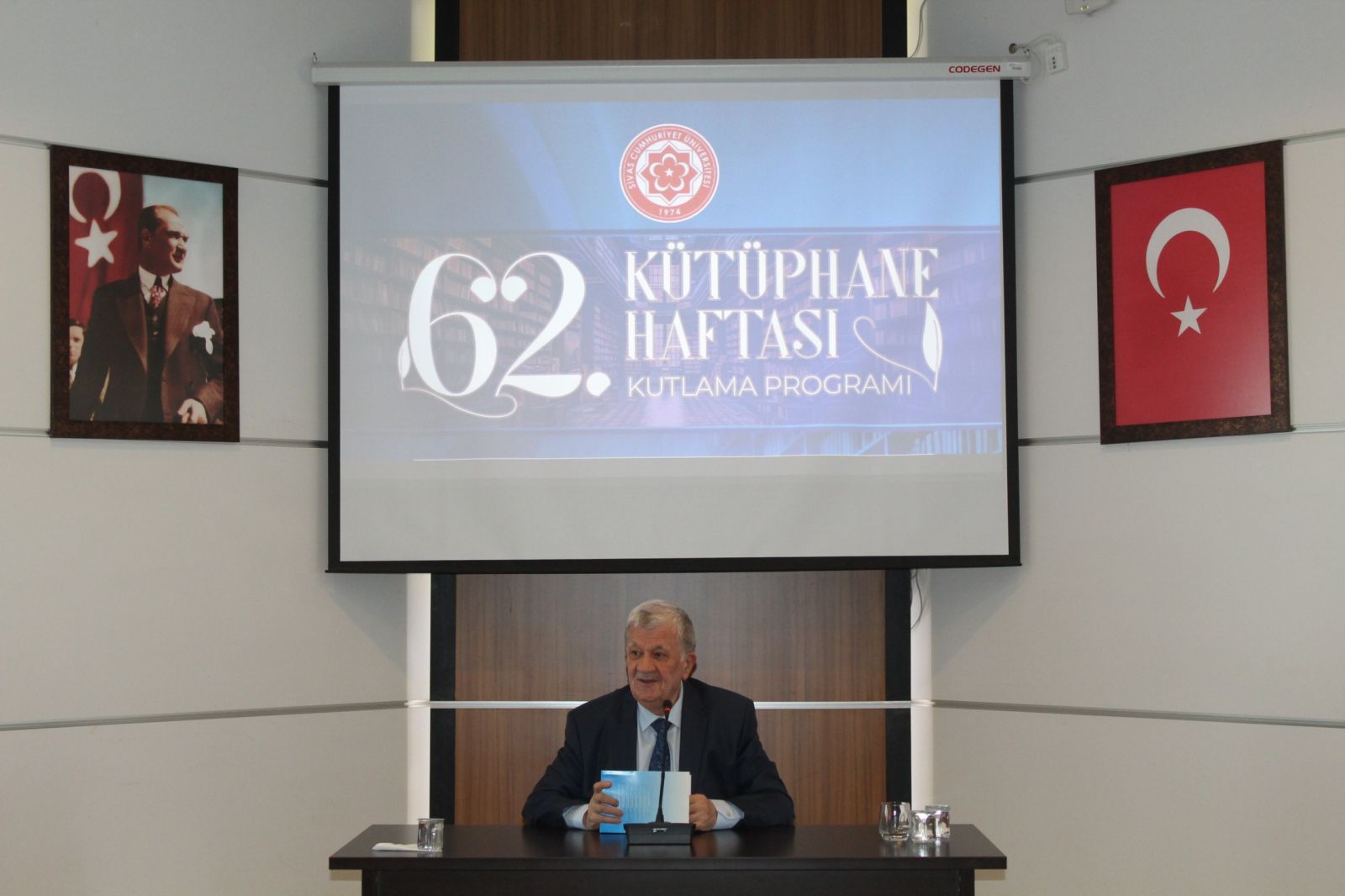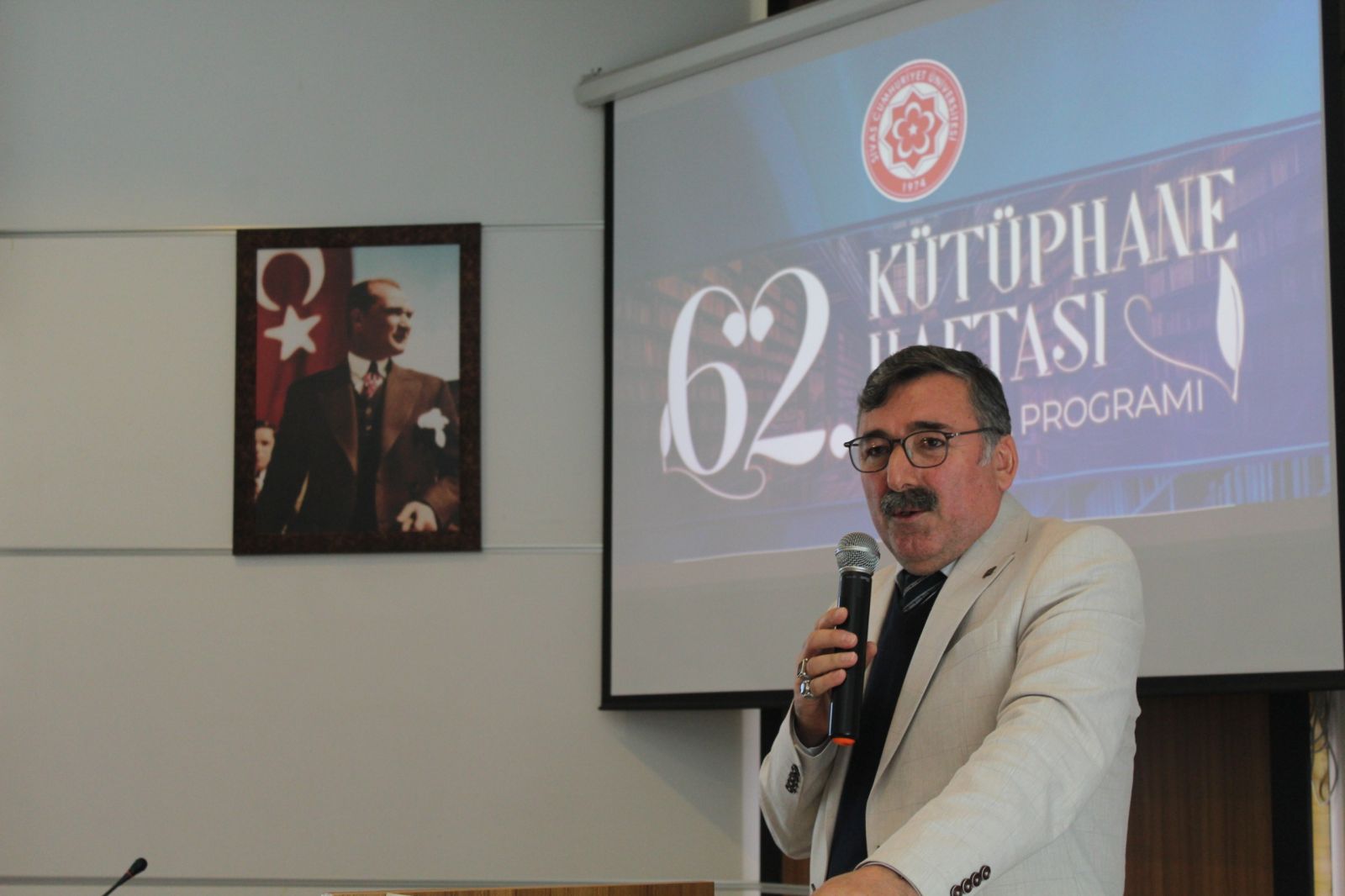 Programda üniversitemize birçok alanda hizmet etmiş olan emekli öğretim üyesi Prof. Dr. Recep Toparlı, Türkçe'nin Belleği: Kitap ve Kütüphane başlıklı bir konuşma yaptı.